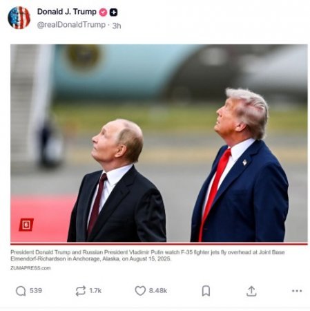 Fotoda liderlərin hər ikisi göyə baxır. Sonrakı paylaşımında Tramp fotosessiya zamanı prezidentlərin üzərindən uçan “B-2” strateji bombardmançı və ABŞ Hərbi Hava Qüvvələrinə məxsus döyüş təyyarələrinin uçuşunu paylaşıb. Fotoşəkildə qeyd olunur ki, təyyarələr “Putini sammitə gələrkən qarşılayıblar”.
