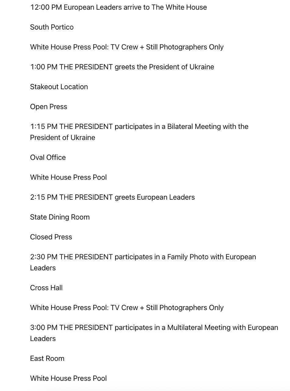 Ağ Ev Donald Trampın Volodimir Zelenski və Aİ liderləri ilə görüşünün cədvəlini dərc edib.Gündəm24.az verir ki, ABŞ prezidenti Donald Tramp və Volodimir Zelenski arasında bazar ertəsi keçiriləcək görüş Bakı vaxtı ilə saat 21:15-də başlayacaq və 1 saat davam edəcək.
