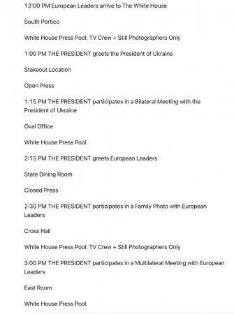 *21:00 – Zelenskinin Ağ Evə gəlişi və rəsmi qarşılama mərasimi;