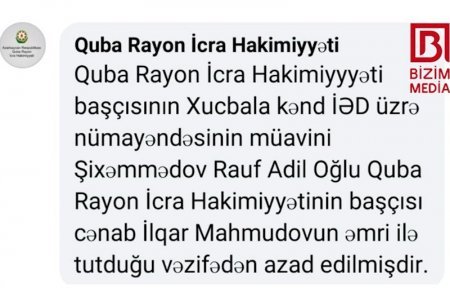 Quba rayon İcra Hakimiyyəti başçısı İlqar Mahmudov rayonun Xucbala İnzibati Ərazi Dairəsi üzrə nümayəndəsinin müavini Rauf Adil oğlu Şıxməmmədovu vəzifəsindən azad edib.