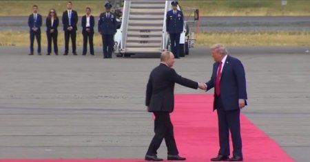 Alyaskada təyyarədən enən Vladimir Putini qırmızı xalçada prezident Donald Tramp özü qarşılayıb.